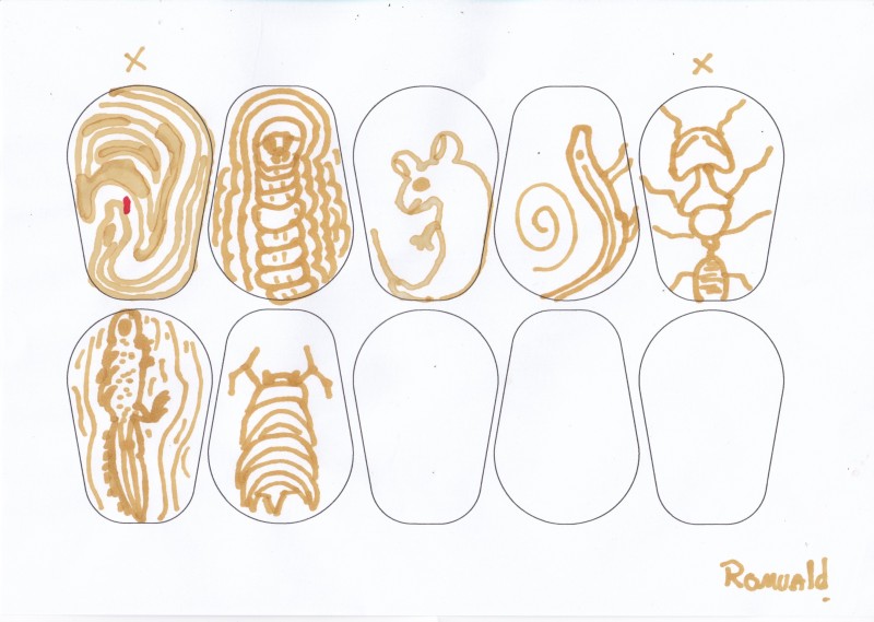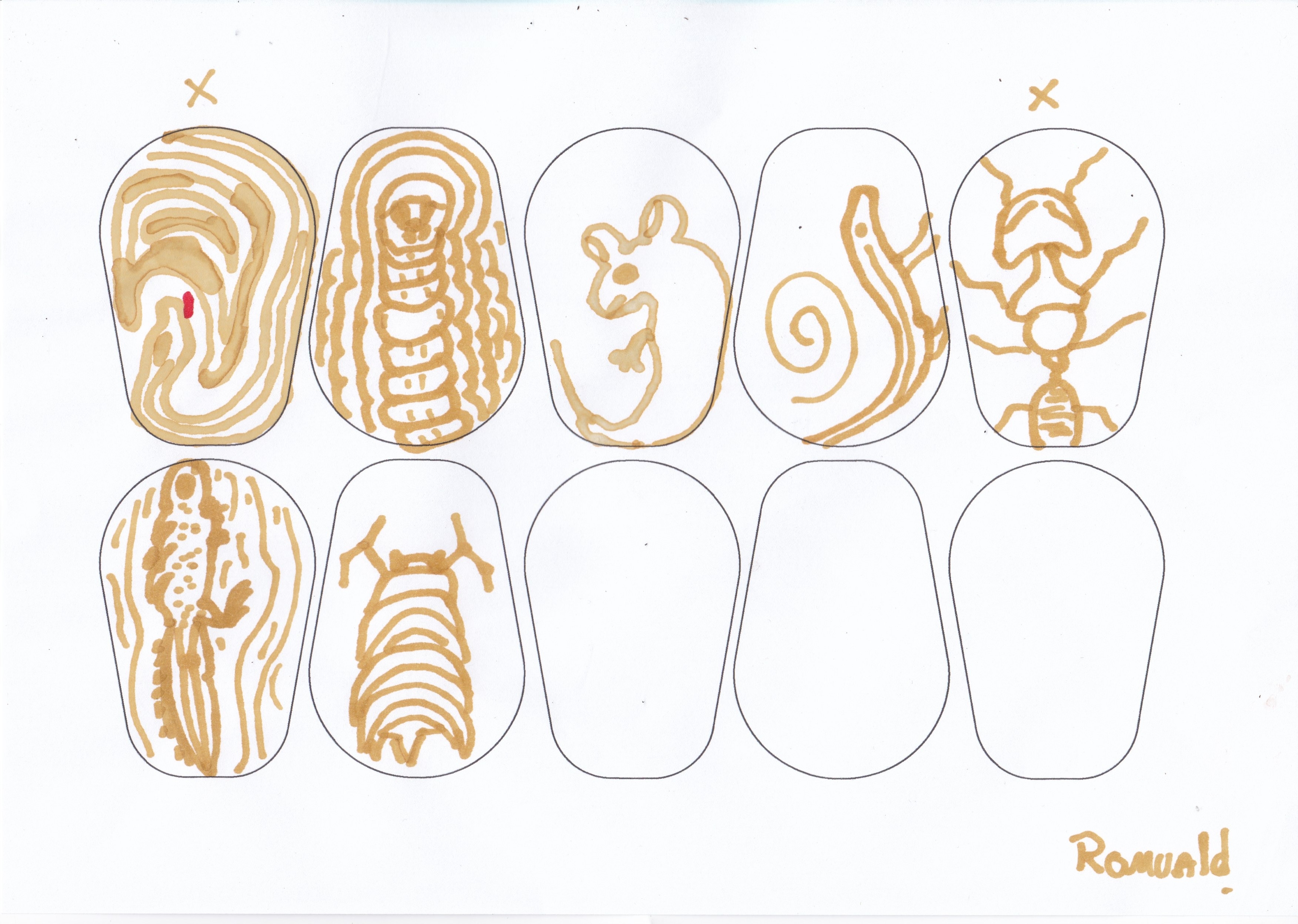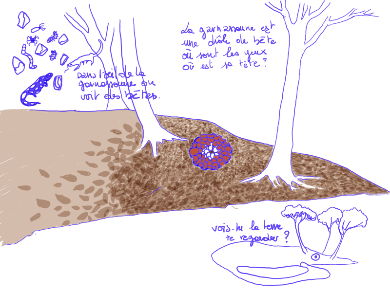 L'installation propose de prêter attention à une vie du sol que les anciennes carrières d'argile accueillent aujourd'hui. Nous avons proposé aux jeunes dessinateurs d'interpréter différentes bêtes salamandre, mulot, cloportes, larves et accueillis dans les remblais qui bordent ce qui est aujourd'hui l'étang de Salzuit.
