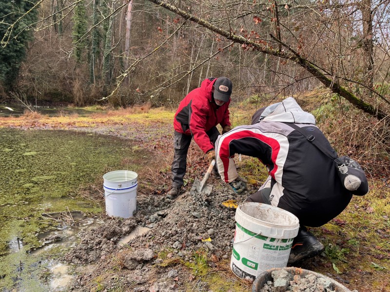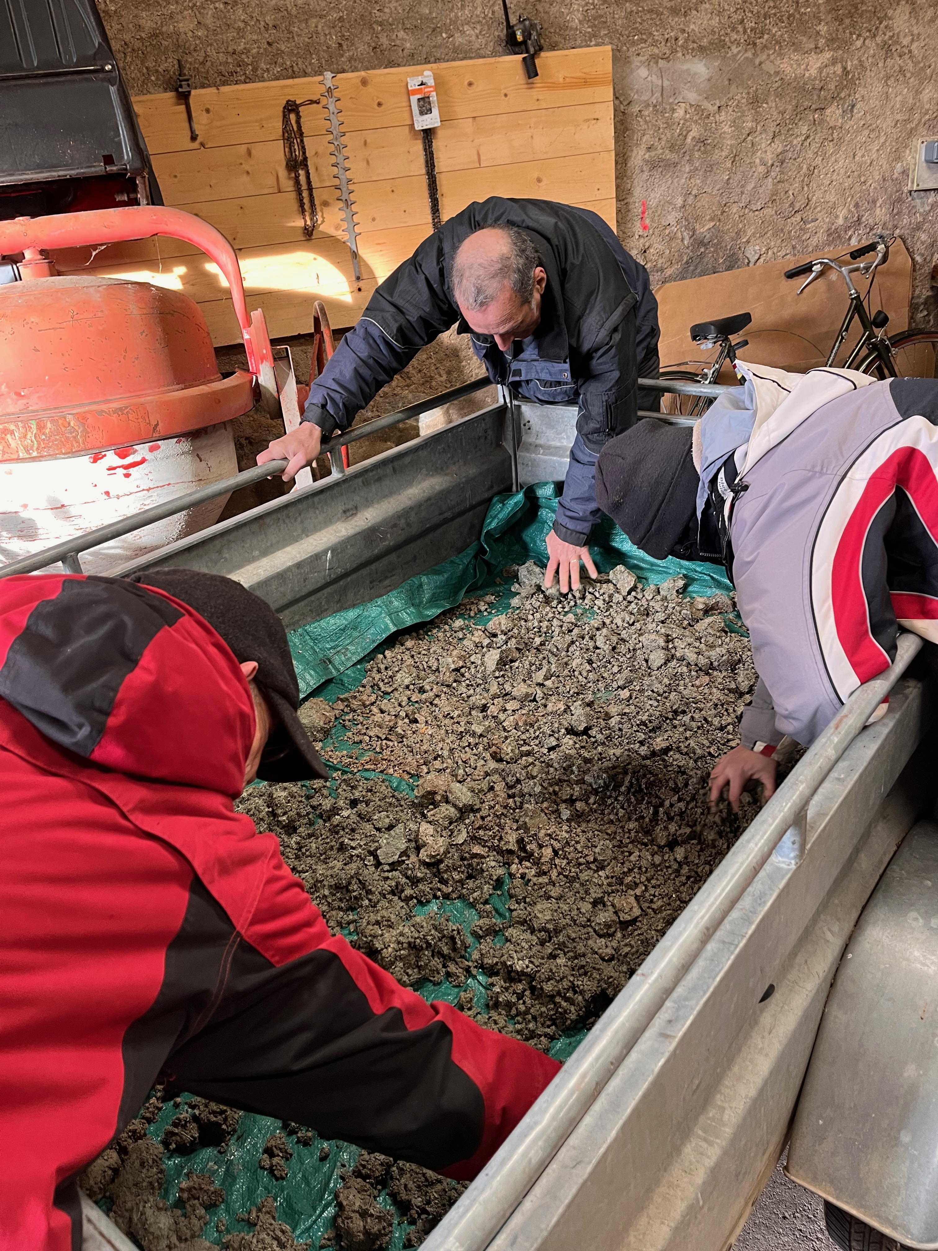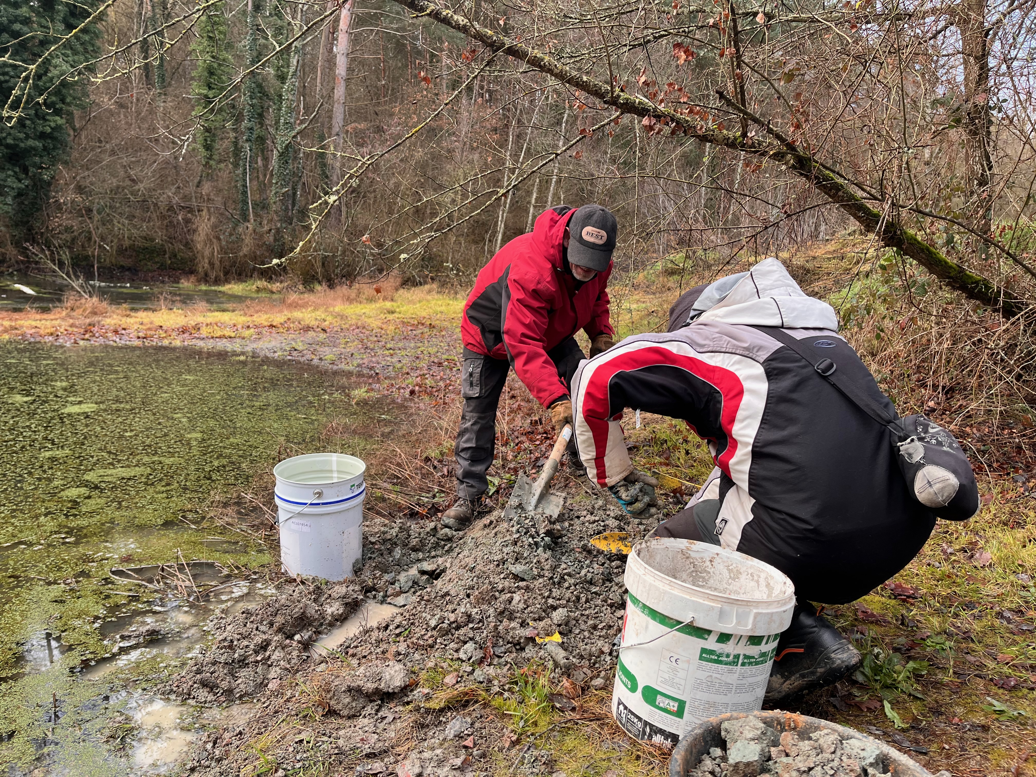 Avec les salarié.es de l'ACI, nous nous rendons à l'étang de la Ganassoune à Salzuit. Iels sont habituellement chargé de son entretient, on peut dire qu'iels connaissent bien les lieux. Dans la veine que nous avons identifié avec Cécile, nous prélevons quelques seaux de terre. Pendant ce temps, nous échangeons avec un des encadrants sur carreaux france ou il a travaillé plusieurs dizaines d'années et son père à la tuilerie avant lui. Les pieds dans cette terre aux qualités plastiques, nous arrivons à la conclusion qu'elle est le matériau qui abrite de la pluie, le gîte d'espèces de zones humides qui profitent des mares qui se forment à cause de son imperméabilité. C'est aussi pour de nombreuses habitant.es humaines du coin ce qui fait la raison d'être ici. Les anciens qui sont venus celleux qui sont resté.es travailler dans les tuileries du bassin paulhaguetois forment les populations d'aujourd'hui. Cette glaise c'est elle qui fait le lit majeur de la Senouire et de l'Allier, il y a donc un lien entre cette qualité de terre et l'eau qui héberge les poissons.