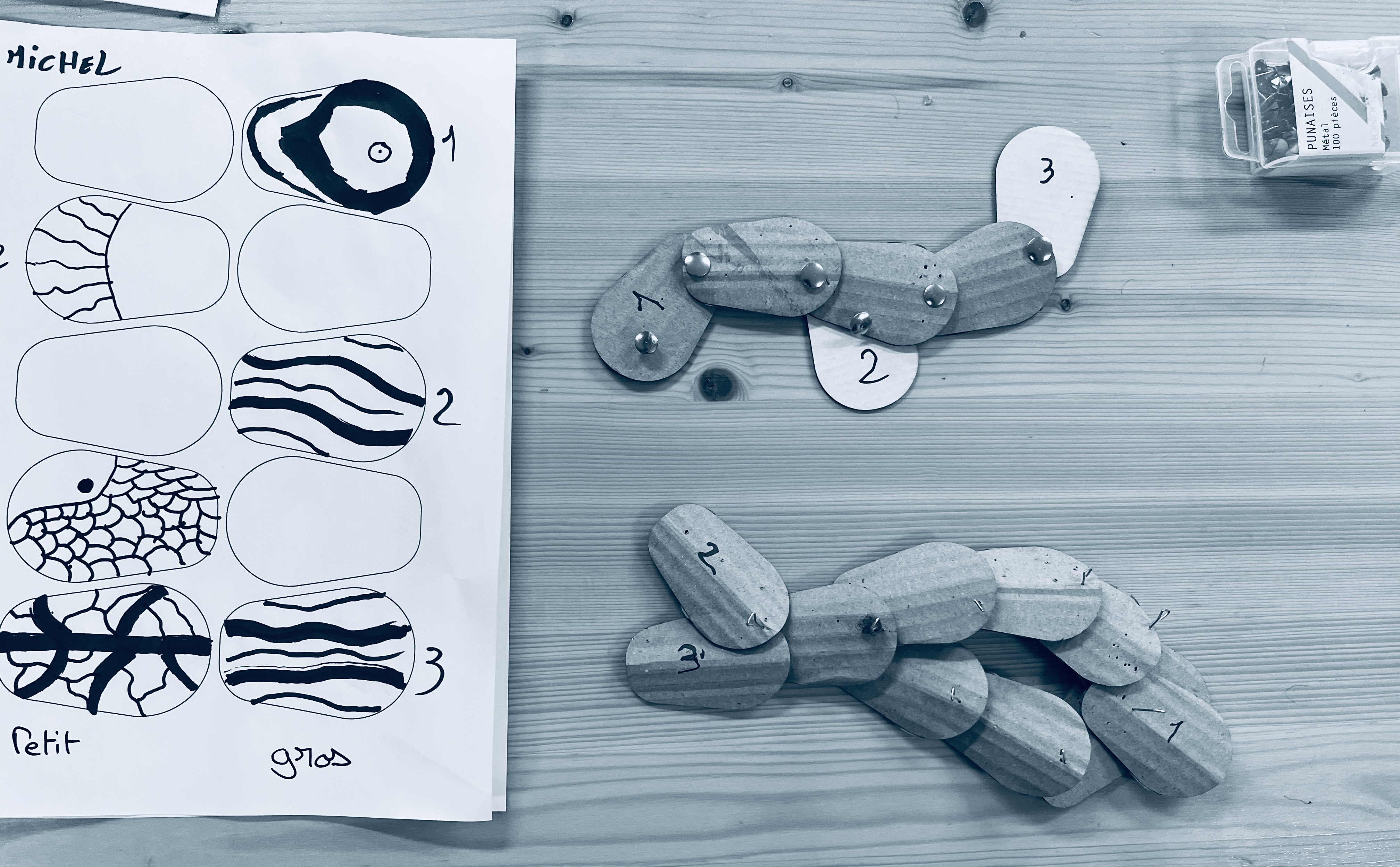 A partir de tuile prédécoupées en carton, nous essayons de maquetter les phases de transformation des saumons.